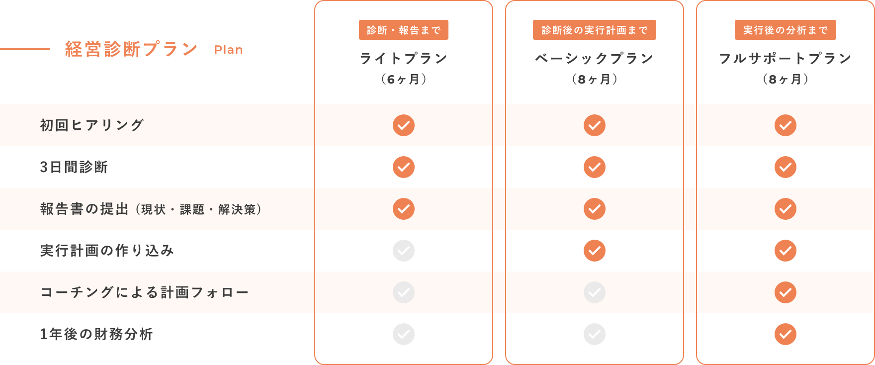 経営診断では、社長や社員の方々にヒアリングをすると同時に、売上データや業務で活用している帳票等を徹底的に分析します。また、目的に応じて現場に1日張り付いて動作分析を行う場合もあります。分析から導き出された結果は、企業様の大切なノウハウとして診断後もお役立ていただけます。