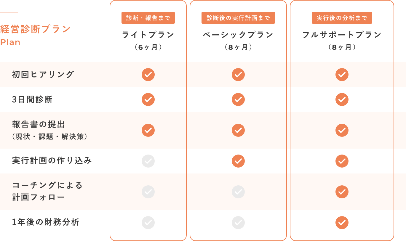 経営診断は、多数の企業支援実績がある中小企業診断士が行います。経営診断により、今まで気づかなかった新たな課題が見つかる場合や自分が考えていた現状や方向性と同じということもあるでしょう。いずれの場合も第三者からの客観的な見方や正しい手順を知ることで、方向性に迷いがなくなり、戦略実現までの行動スピードの加速が期待できます。